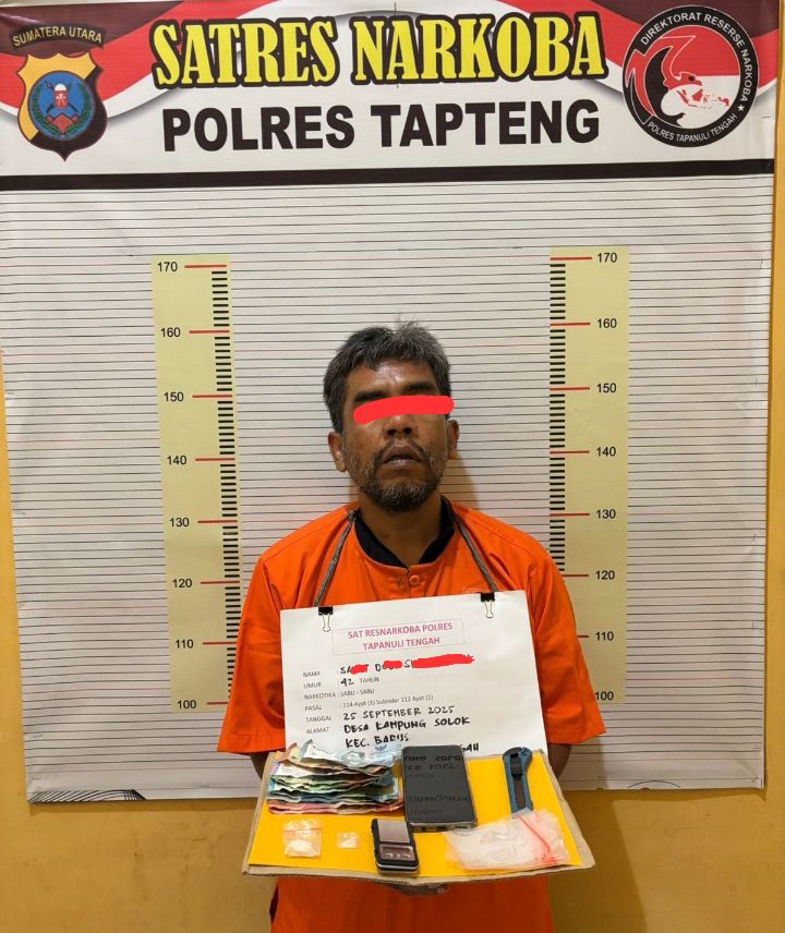 MajalahCeo.id I Tapteng (Sumut) – Tapanuli  Tengah – Satuan Reserse Narkoba (Sat Narkoba) Polres Tapanuli Tengah (Tapteng) berhasil menangkap seorang residivis pengedar sabu-sabu berinisial SJ (42) di Kecamatan Barus. Dari penangkapan yang dilakukan pada Jumat malam, 26 September 2025, petugas menyita total 2,74 gram sabu siap edar dan sejumlah barang bukti lainnya.