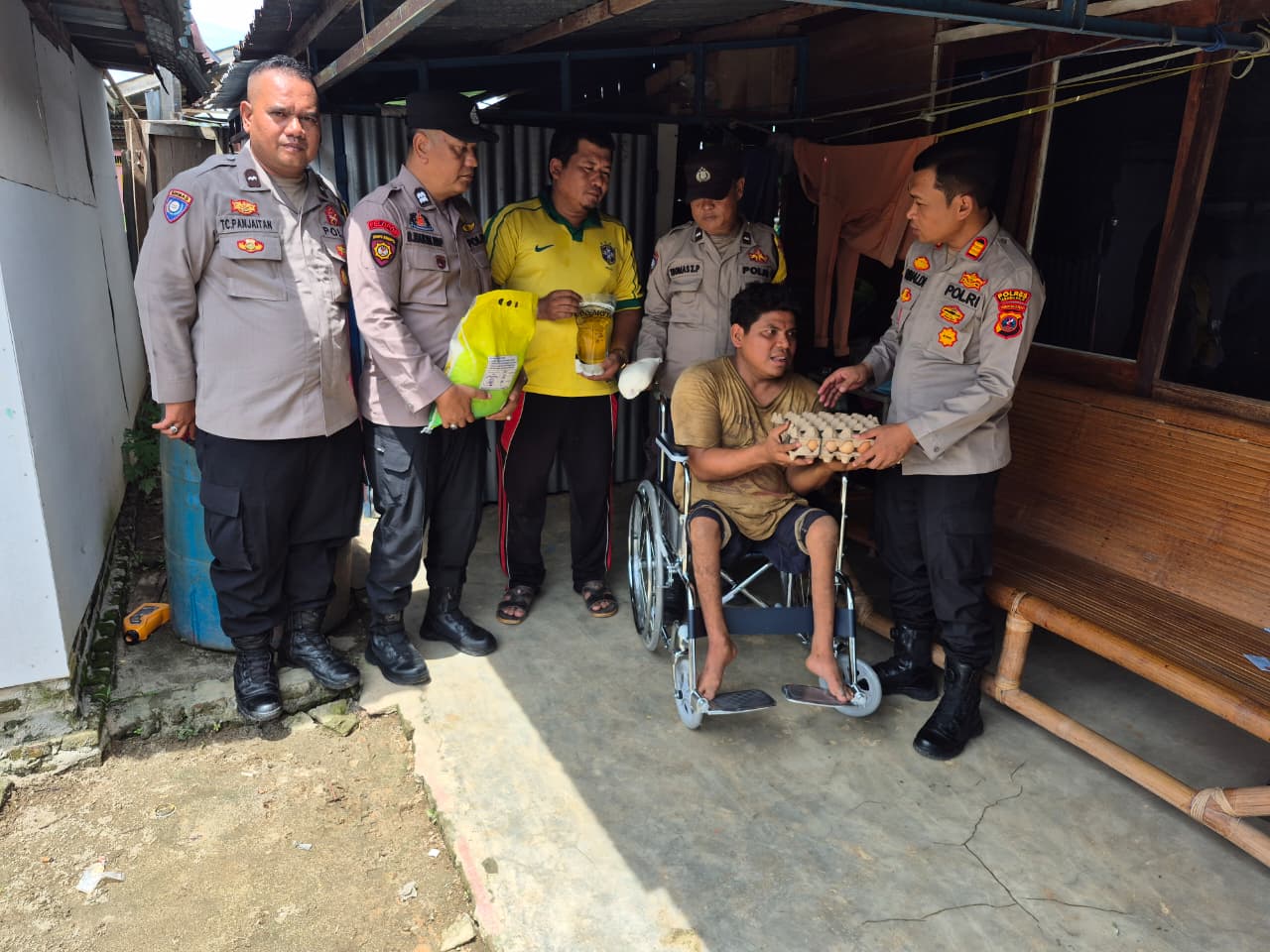 Bertempat di jalan Kirab Remaja Lingkungan I Kelurahan Pematang Pasir Kecamatan Teluk Nibung Kota Tanjungbalai, Kapolsek Teluk Nibung AKP Rinaldi SH, MH bersama personil Polsek Teluk Nibung dengan didampingi kepala lingkungan memberikan bantuan kursi roda kepada Whan Edi Syahputra umur 38 tahun.
