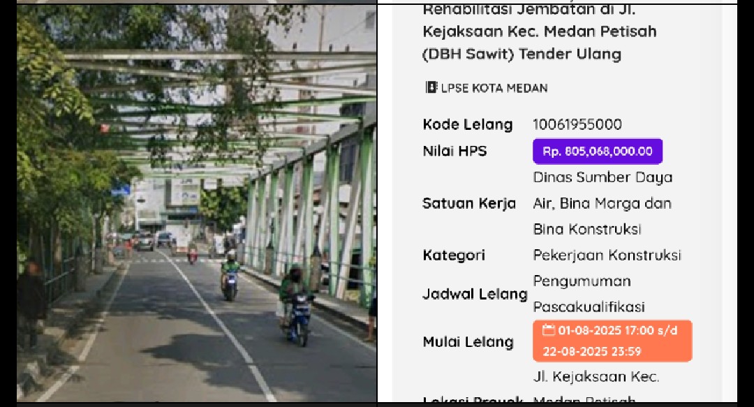 Berdasarkan Informasi yang di himpun awak media bahwa ada penutupan jalan selama sebulan dari bulan oktober hingga Desember 2025 karena proyek Rehabilitasi Rangka Baja Jembatan jalan Kejaksaan Kelurahan Petisah Tengah Kecamatan Medan Petisah Kota Medan.