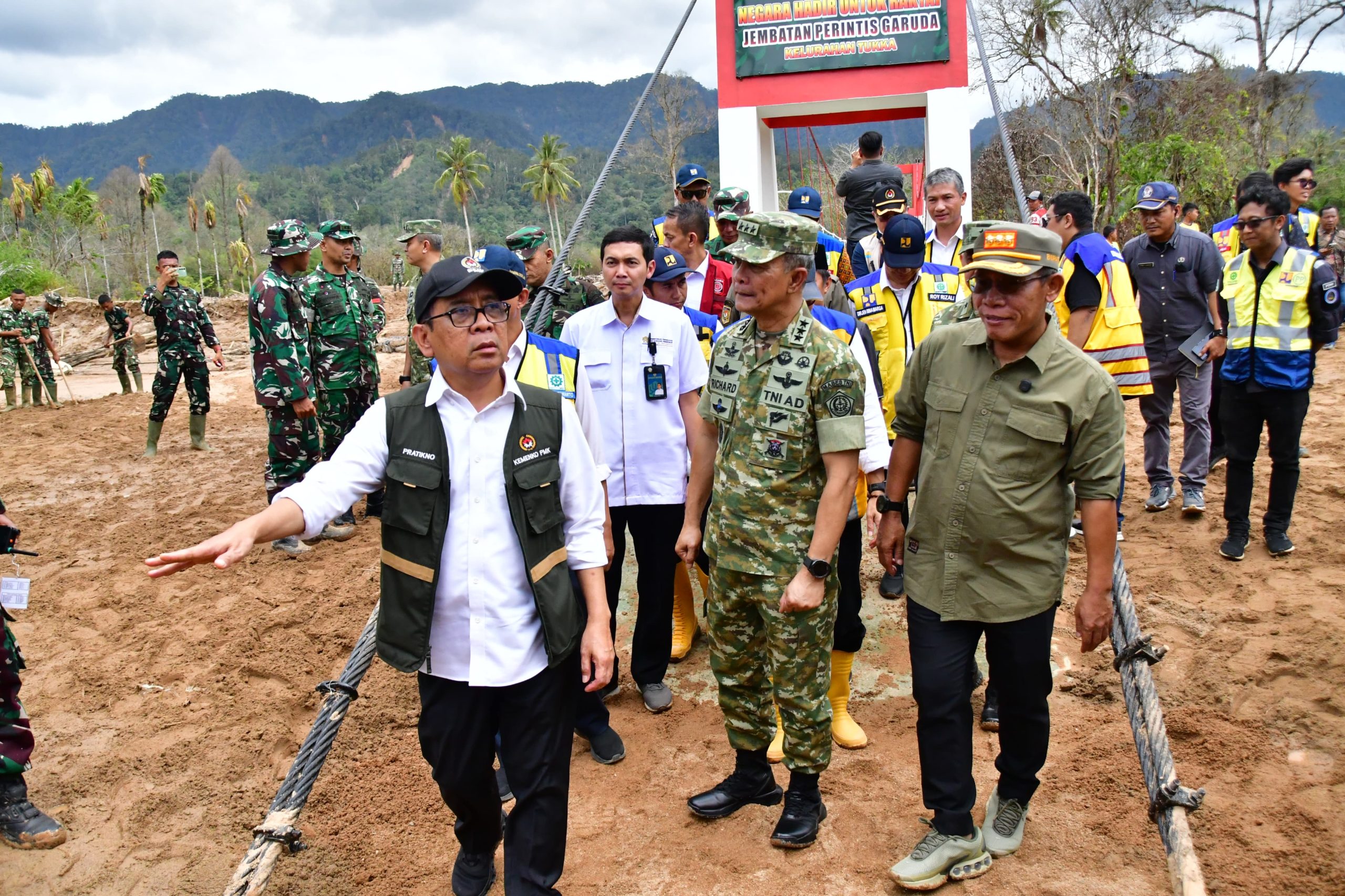 Menko PMK Prof. Dr. Pratikno, M.Soc.Sc, menyampaikan, saya bersama dengan Kepala Staf Umum (Kasum) TNI Letjen TNI Richard Taruli Horja Tampubolon, S.H., M.M. dan Bupati Tapteng Masinton Pasaribu, SH, MH, dan dari Kementerian PU meninjau lapangan Jembatan Gantung Perintis Garuda di Kelurahan Tukka Kecamatan Tukka Kabupaten Tapteng.