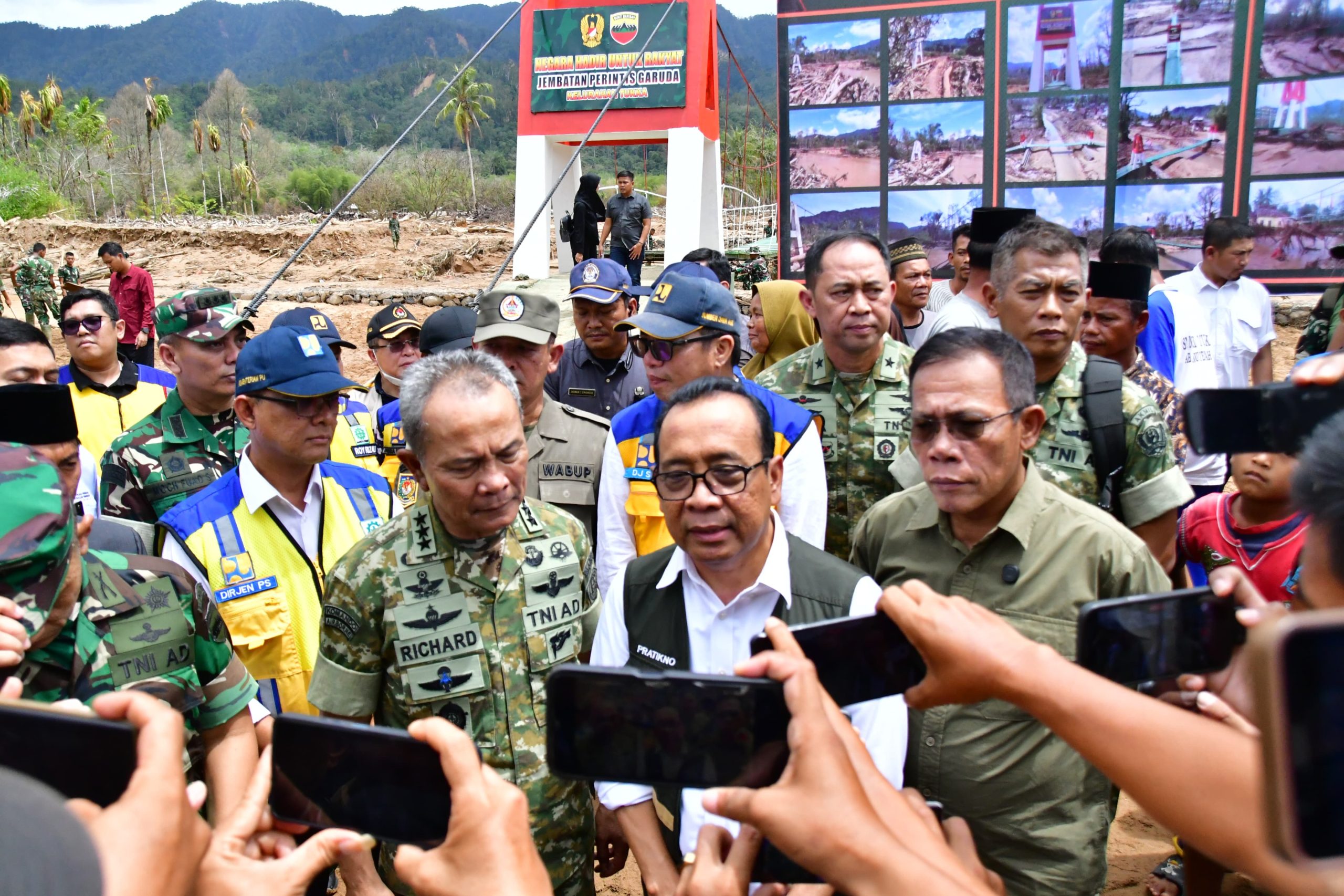 MajalahCeo.id I Tapteng (Sumut) – TAPANULI TENGAH – Kolaborasi Pusat dan Daerah Tinjau Pascabencana Banjir Tapanuli Tengah (Tapteng), Menteri Koordinator Bidang Pembangunan Manusia dan Kebudayaan (Menko PMK) Prof. Dr. Pratikno, M.Soc.Sc dan Kepala Staf Umum (Kasum) TNI Letjen TNI Richard Taruli Horja Tampubolon, S.H., M.M, didampingi oleh Bupati Tapteng Masinton Pasaribu, SH, MH dan Wakil Bupati Tapteng Mahmud Efendi pada Jumat 13 Februari 2026, meninjau Jembatan Gantung Perintis Garuda di Kelurahan Tukka Kecamatan Tukka Kabupaten Tapanuli Tengah, Provinsi Sumatera Utara.