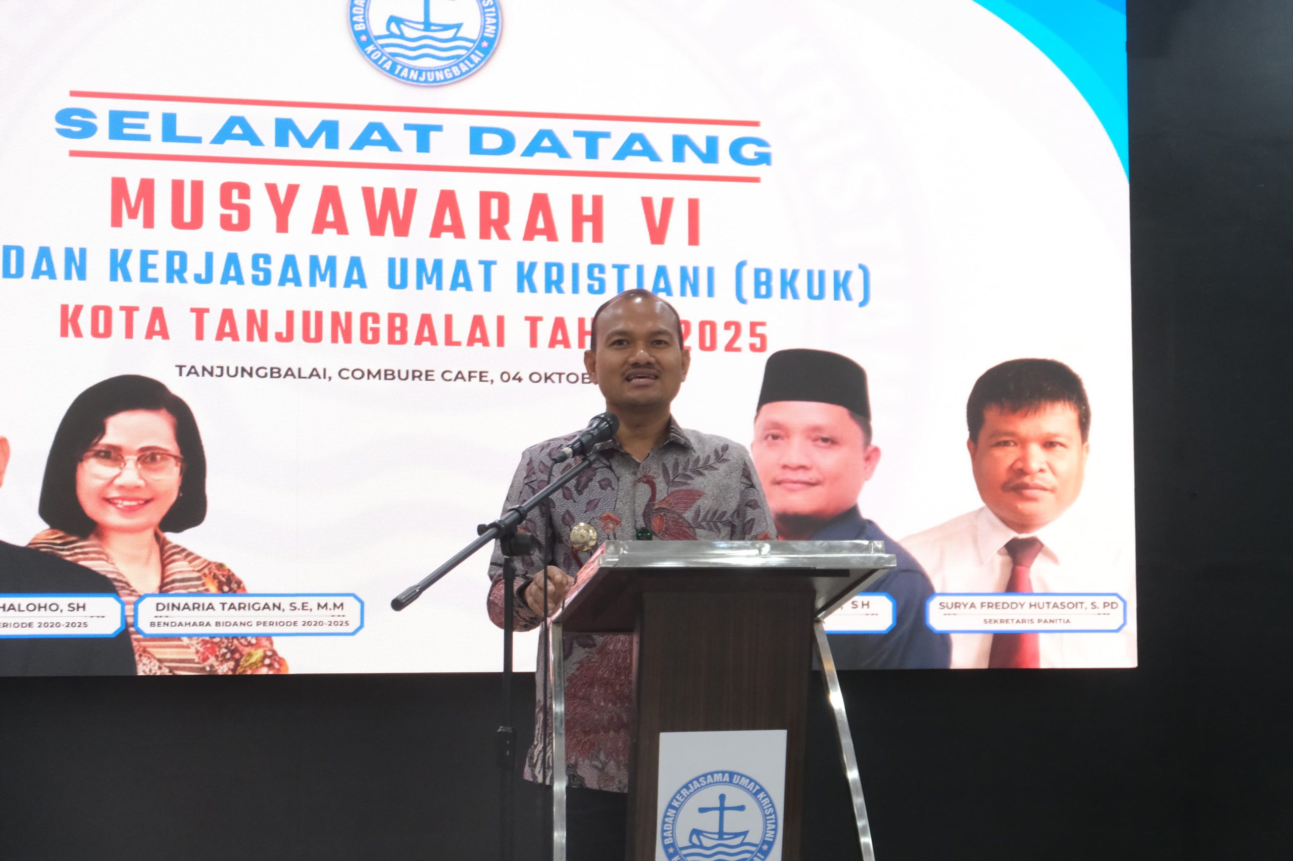 Ha ini disampaikan Wali Kota Tanjungbalai Mahyaruddin Salim saat membuka Musyawarah VI Badan Kerjasama Umat Kristiani (BKUK) Tahun 2025 Kota Tanjungbalai yang dilaksanakan di Combure Cafe, Jalan Sudirman Kelurahan Pahang Kecamatan Datuk Bandar, Kota Tanjungbalai, Sabtu (4-10-2025).